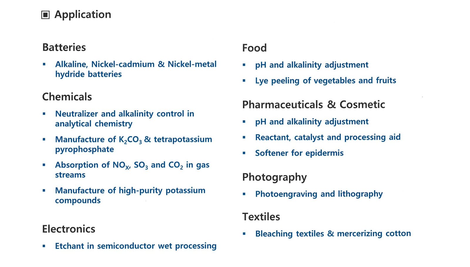 Potassium carbonate is a white salt, soluble in water, which forms a strongly alkaline solution. Used for glass, fertilizer, plastic, oilfield and chemical manufacturing.